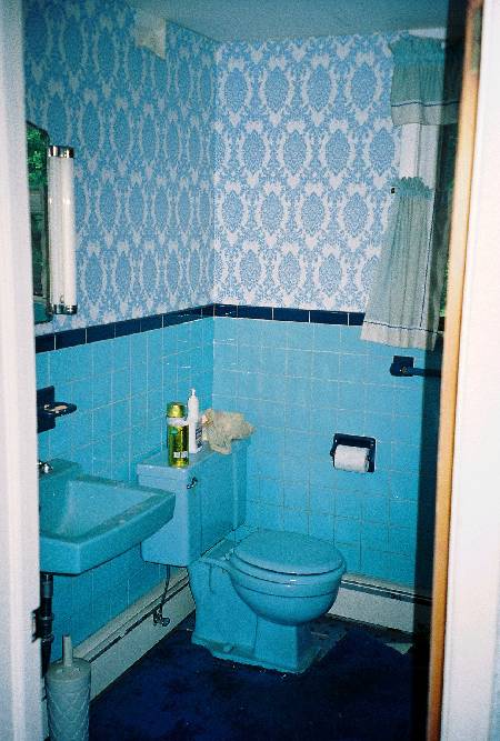 The upstairs bath. In a few weeks there will be stud walls where you see all the blue. (The new bathroom will feature white fixtures, but it will have some color and new neutral tile.)