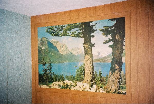 This is a close-up of the "Mountain View." You can clearly see that the paneling effect is merely wallpaper of the wallpaper mural of the mountain scene. And you thought it was a real window... :)