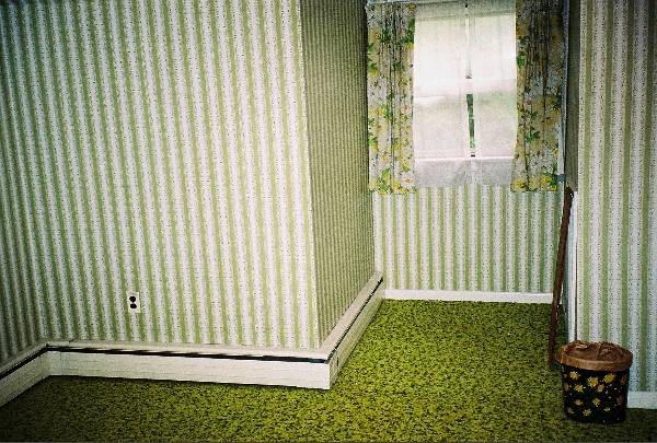 This room highlights the previous owners decorating style. Notice how the wallpaper, carpet and windows treatment works together. This wallpaper (and the jet-fighter layer underneath) is gone now. The carpet will be gone soon; right now it's acting as a convenient form fitted drop cloth.